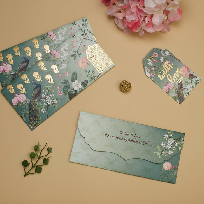 Imagine a courtyard adorned with the resplendent hues of a peacock's feathers—the "Peacock Courtyard" Handmade Money Envelope captures this majestic elegance. The intricate peacock motif, a symbol of beauty and grace, serves as a metaphor for the couple's journey ahead. This envelope not only encases a monetary gift but becomes a regal emblem of the deep and lasting love you wish to bestow upon the newlyweds.