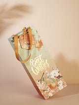 Elevate your gift-giving with the ideal bottle bag for wine, standard whiskey, or liquor bottles. The exquisite design features gold foiled elements, creating a truly captivating experience. The handles are adorned with a fine herringbone pattern ribbon, adding an extra touch of sophistication.