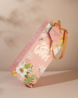 Elevate your gift-giving with the ideal bottle bag for wine, standard whiskey, or liquor bottles. The exquisite design features gold foiled elements, creating a truly captivating experience. The handles are adorned with a fine herringbone pattern ribbon, adding an extra touch of sophistication.