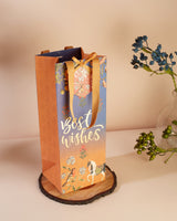 Elevate your gift-giving with the ideal bottle bag for wine, standard whiskey, or liquor bottles. The exquisite design features gold foiled elements, creating a truly captivating experience. The handles are adorned with a fine herringbone pattern ribbon, adding an extra touch of sophistication.