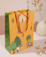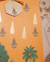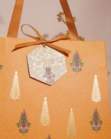 Indulge in the sheer opulence of this meticulously designed gift bag. Crafted to perfection, it's tailor-made for presenting small to medium-sized treasures. Its resplendent gold foiled embellishments exude luxury, while the handles are adorned with a fine herringbone pattern ribbon, adding an exquisite touch. Choose to personalize the tags with your names for a truly bespoke experience.