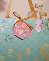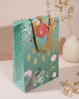 Indulge in the sheer opulence of this meticulously designed gift bag. Crafted to perfection, it's tailor-made for presenting small to medium-sized treasures. Its resplendent gold foiled embellishments exude luxury, while the handles are adorned with a fine herringbone pattern ribbon, adding an exquisite touch. Choose to personalize the tags with your names for a truly bespoke experience.