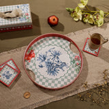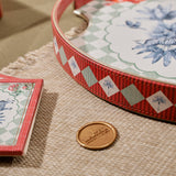 Dramatic and daring, Jungle Masquerade is couture for the wild at heart. Geometric harlequin patterns meet striped zebras, crafting a carnival of mystery, art, and untamed style. A circle built for service and style. With cut-out side handles and light gold trims, this tray is finished in premium vegan leather - turning everyday hosting into a statement on your table.