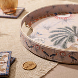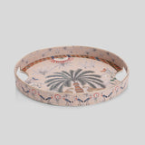 Rooted in strength, Palm Bastion celebrates the timeless union of leopards and palms. Terracotta borders echo heritage architecture, while the wild and the regal stand guard in bold harmony. A circle built for service and style. With cut-out side handles and light gold trims, this tray is finished in premium vegan leather - turning everyday hosting into a statement on your table.