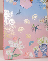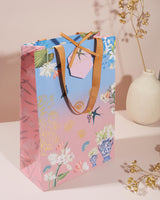 Indulge in the sheer opulence of this meticulously designed gift bag. Crafted to perfection, it's tailor-made for presenting small to medium-sized treasures. Its resplendent gold foiled embellishments exude luxury, while the handles are adorned with a fine herringbone pattern ribbon, adding an exquisite touch. Choose to personalize the tags with your names for a truly bespoke experience.