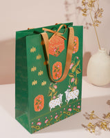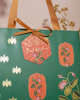 Indulge in the sheer opulence of this meticulously designed gift bag. Crafted to perfection, it's tailor-made for presenting small to medium-sized treasures. Its resplendent gold foiled embellishments exude luxury, while the handles are adorned with a fine herringbone pattern ribbon, adding an exquisite touch. Choose to personalize the tags with your names for a truly bespoke experience.