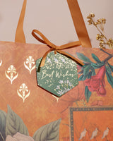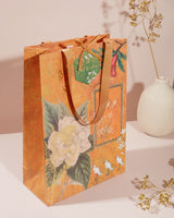 Indulge in the sheer opulence of this meticulously designed gift bag. Crafted to perfection, it's tailor-made for presenting small to medium-sized treasures. Its resplendent gold foiled embellishments exude luxury, while the handles are adorned with a fine herringbone pattern ribbon, adding an exquisite touch. Choose to personalize the tags with your names for a truly bespoke experience.