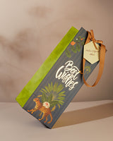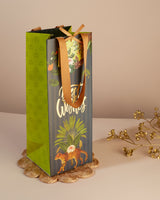 Elevate your gift-giving with the ideal bottle bag for wine, standard whiskey, or liquor bottles. The exquisite design features gold foiled elements, creating a truly captivating experience. The handles are adorned with a fine herringbone pattern ribbon, adding an extra touch of sophistication.