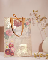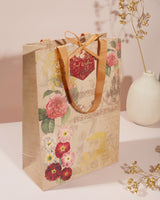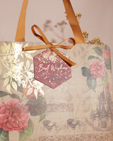 Indulge in the sheer opulence of this meticulously designed gift bag. Crafted to perfection, it's tailor-made for presenting small to medium-sized treasures. Its resplendent gold foiled embellishments exude luxury, while the handles are adorned with a fine herringbone pattern ribbon, adding an exquisite touch. Choose to personalize the tags with your names for a truly bespoke experience.
