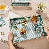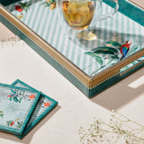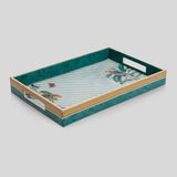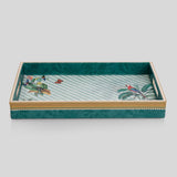 Refined and lush, Verdura Court is an ode to tropical gardens. Exotic birds and botanicals unfurl across elegant stripes, balancing vibrant escape with stately order. Generous in space, sleek in profile. With gold-finished trims and practical cut-out handles, the rectangle tray is bound in vegan leather - built for grand spreads, display, or order with authority.